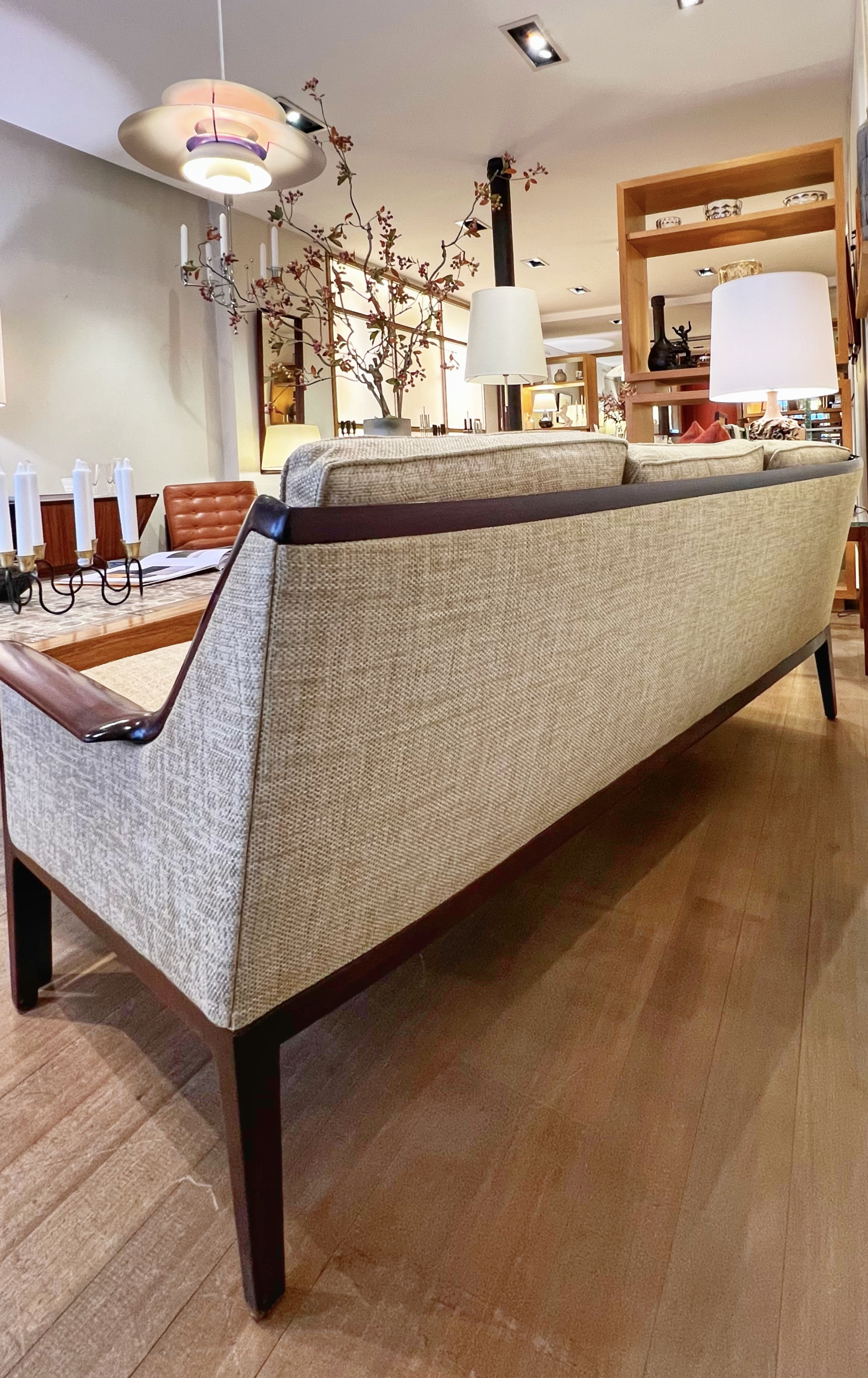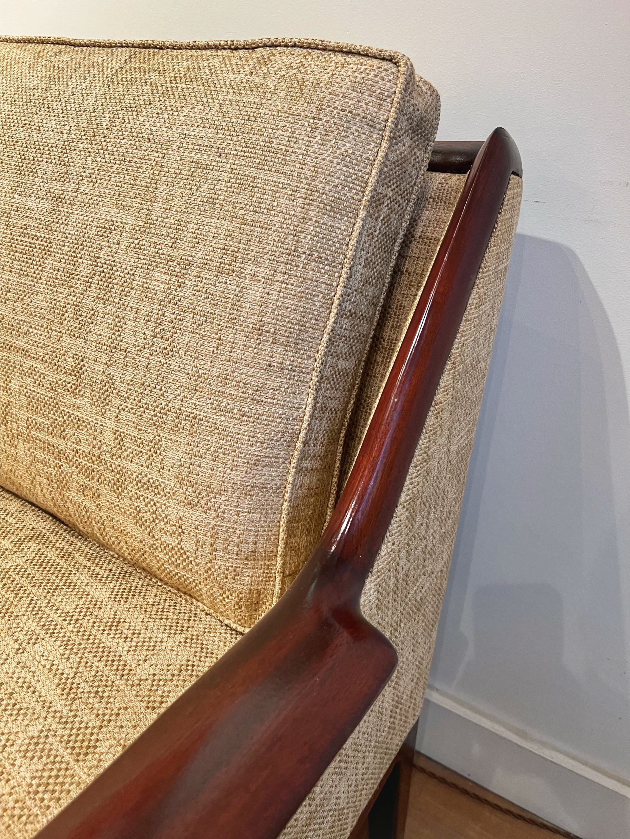 3-seater mahogany sofa with plain straw-colored fabric, reversible zip cushions