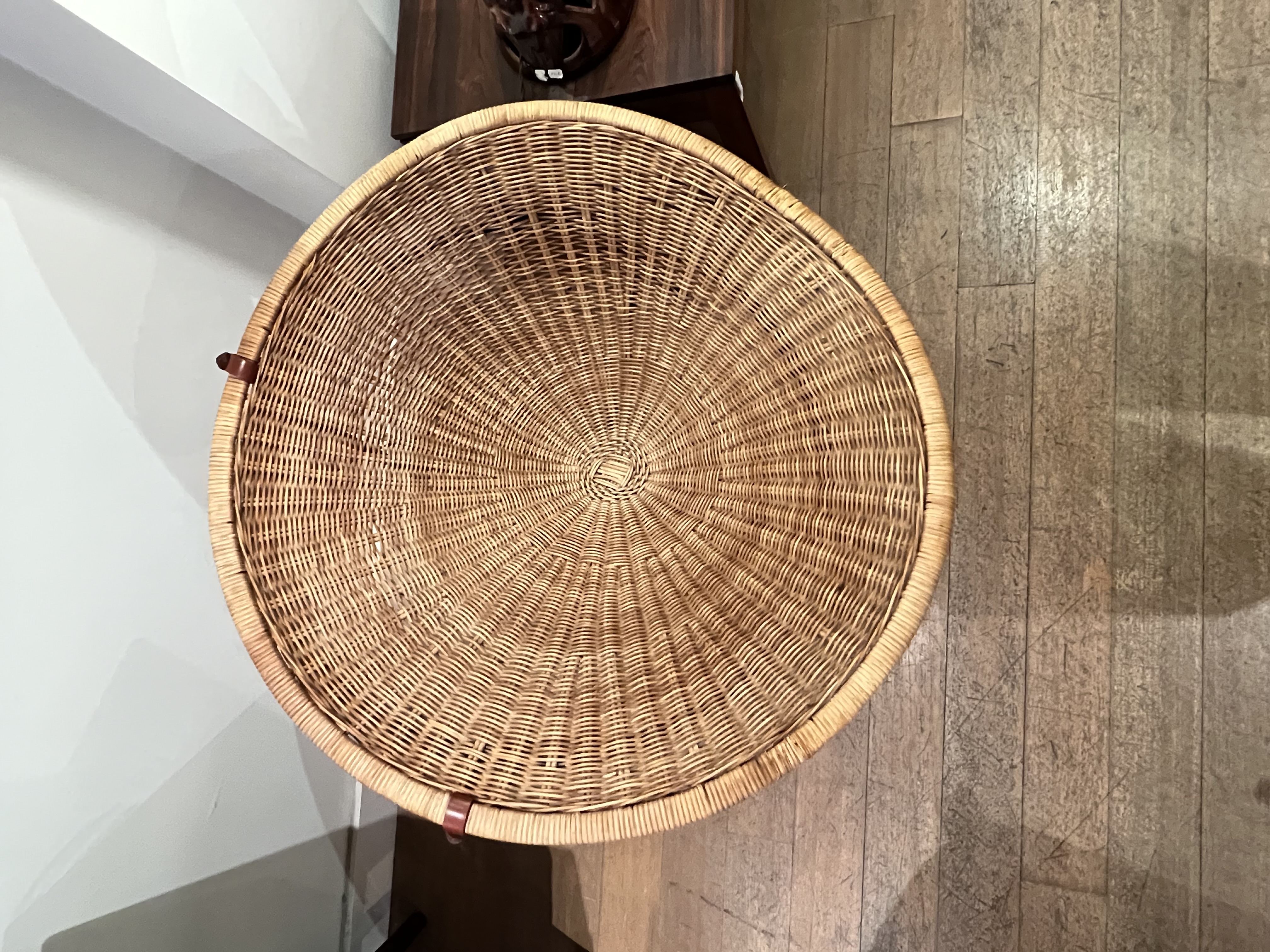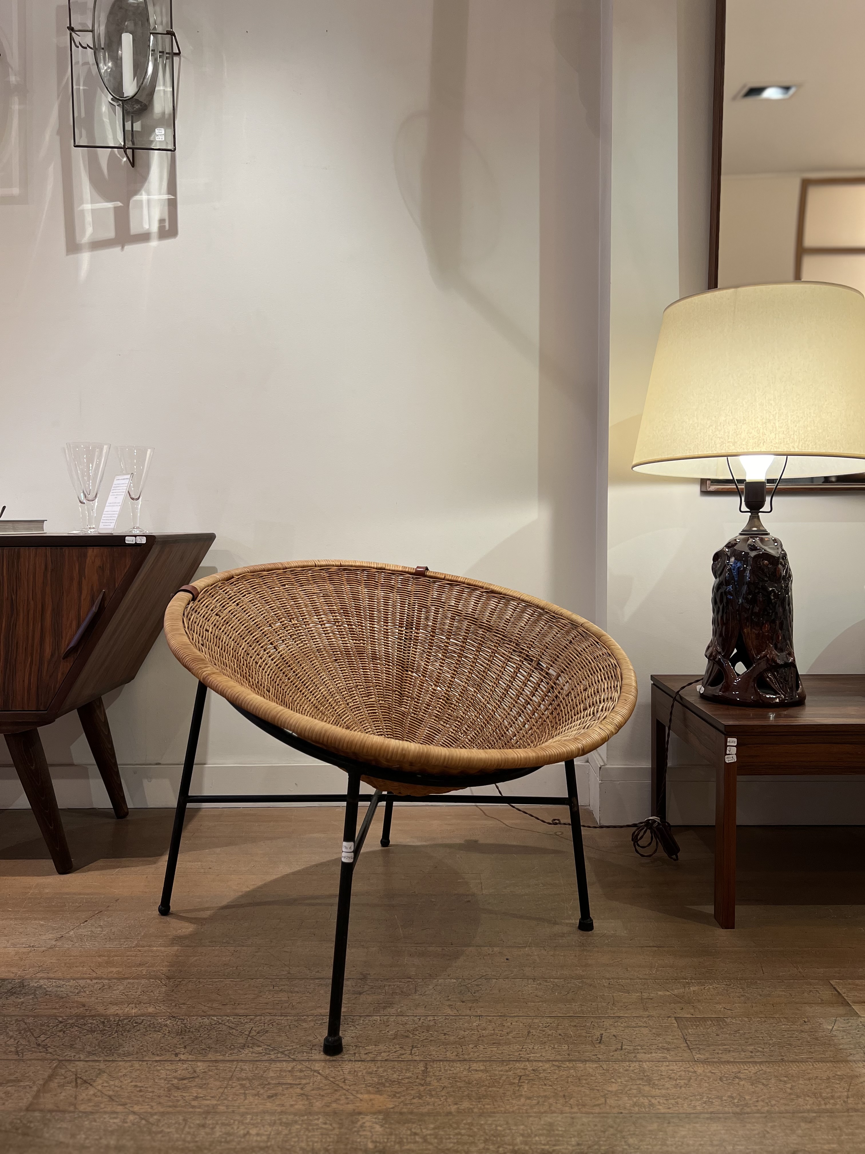 Pot armchair with a wicker seat on a black iron frame covered with leather straps.